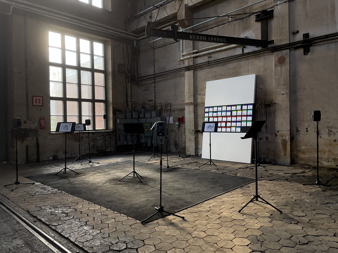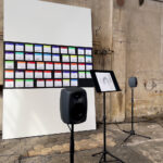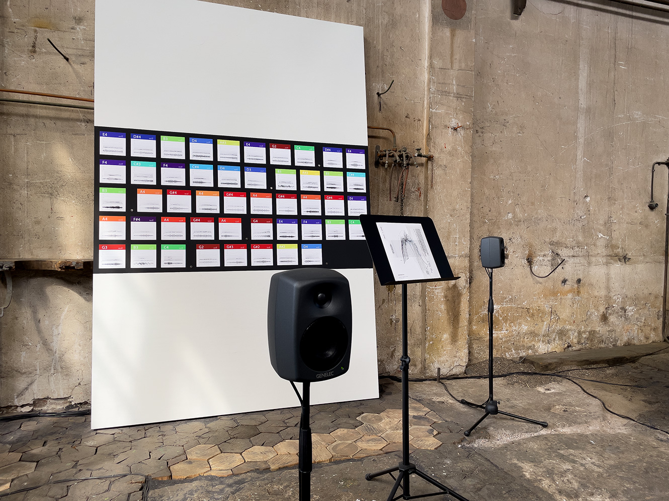 “What happens to the fleeting sounds of slogans chanted on the streets? Humming is a sound work that draws on six chants from Thailand, Russia, the United States, Chile, and Hong Kong, such as ‘no justice no peace’ from the Black Lives Matter movement in America. Maridet breaks these down into syllables, which are then transformed into individual notes collectively forming 48 notes that can be arranged to recreate sonic variations — a stream of musical humming of global slogans combined. Each syllable-note has a distinctive profile of pitch, colour, and tone, and is catalogued into a chart. The six slogans are also transformed into a two-dimensional soundscape placed on music stands like score sheets, set among a cluster of figure-like speakers. Viewers walk between this crowd of ‘sounds,’ creating their own sonic encounters of broken-down notes that once shook the world. Every two hours, the soundscape swells into a performance of chants.” — Yeewan Koon, curator of So long, thanks again for the fish, Levyhalli, Suomenlinna, Helsinki.